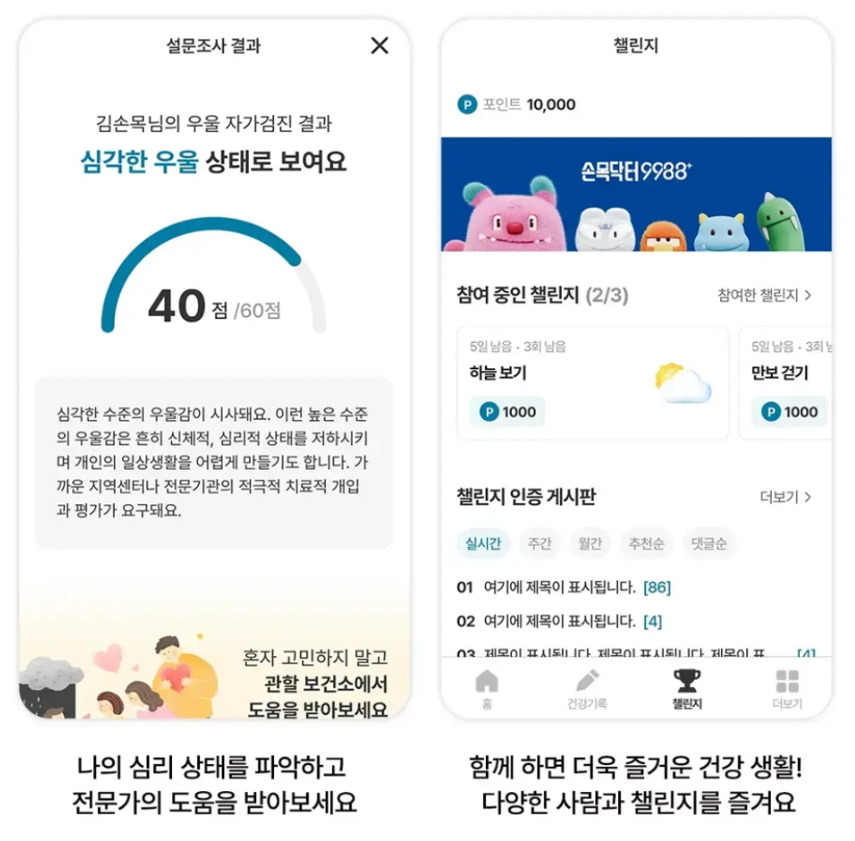 단순히 걷기만 장려하는 앱이 아닙니다. 손목닥터 9988+는 대사증후군 위험군에 속한 시민들을 위해 맞춤 건강관리를 지원합니다. 건강검진 결과를 앱과 연동해 개인 맞춤 식단, 운동 플랜을 제공하고, 혈압, 혈당 등 주요 지표를 지속적으로 추적할 수 있어 자기 건강을 체계적으로 관리할 수 있습니다. 또한, 우울증과 스트레스 자가진단 기능도 포함되어 있어 정신 건강까지 세심하게 돌볼 수 있습니다.